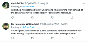 Another post, under the name of Sir Humphrey Whittingstall, read: “Sounds great. It will come as such a comfort to my sister in law who has been waiting 3 days for someone to attend to her leaking catheter.”