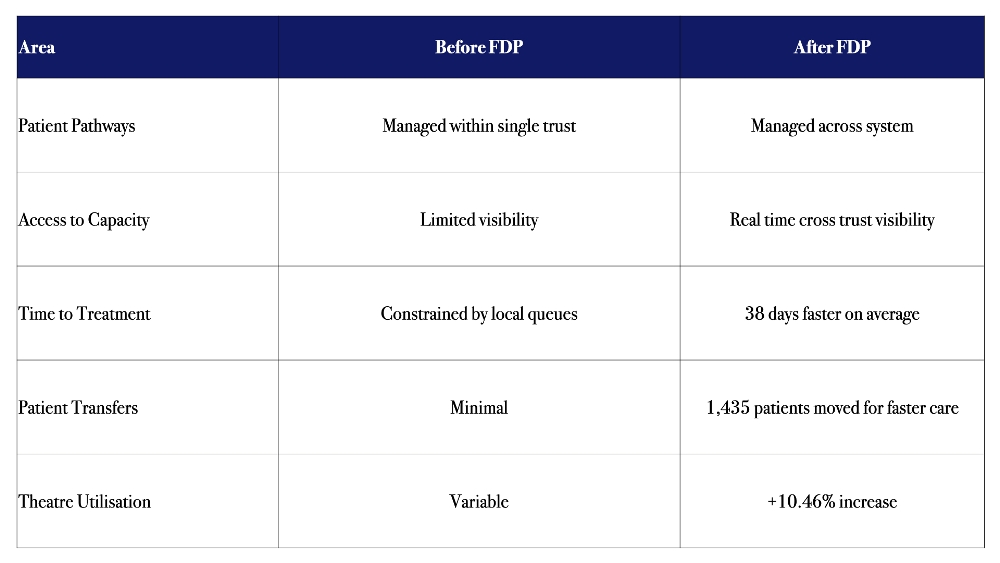 For the first time, teams could see demand and capacity across both organisations in real time. Patients were no longer bound to a single provider pathway.